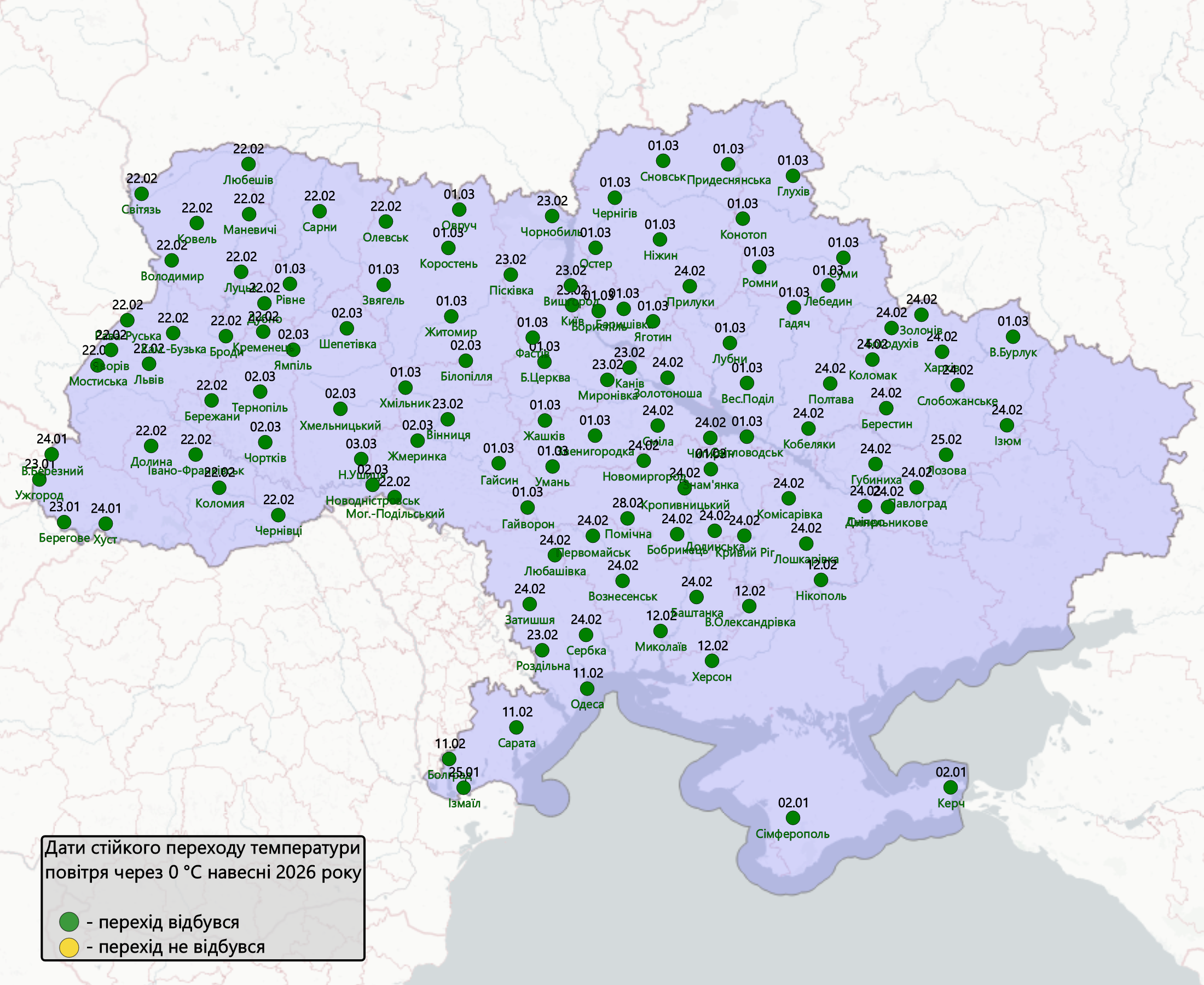 Дати переходу температури повітря через 0 оС у бік підвищення на 04.03.2026