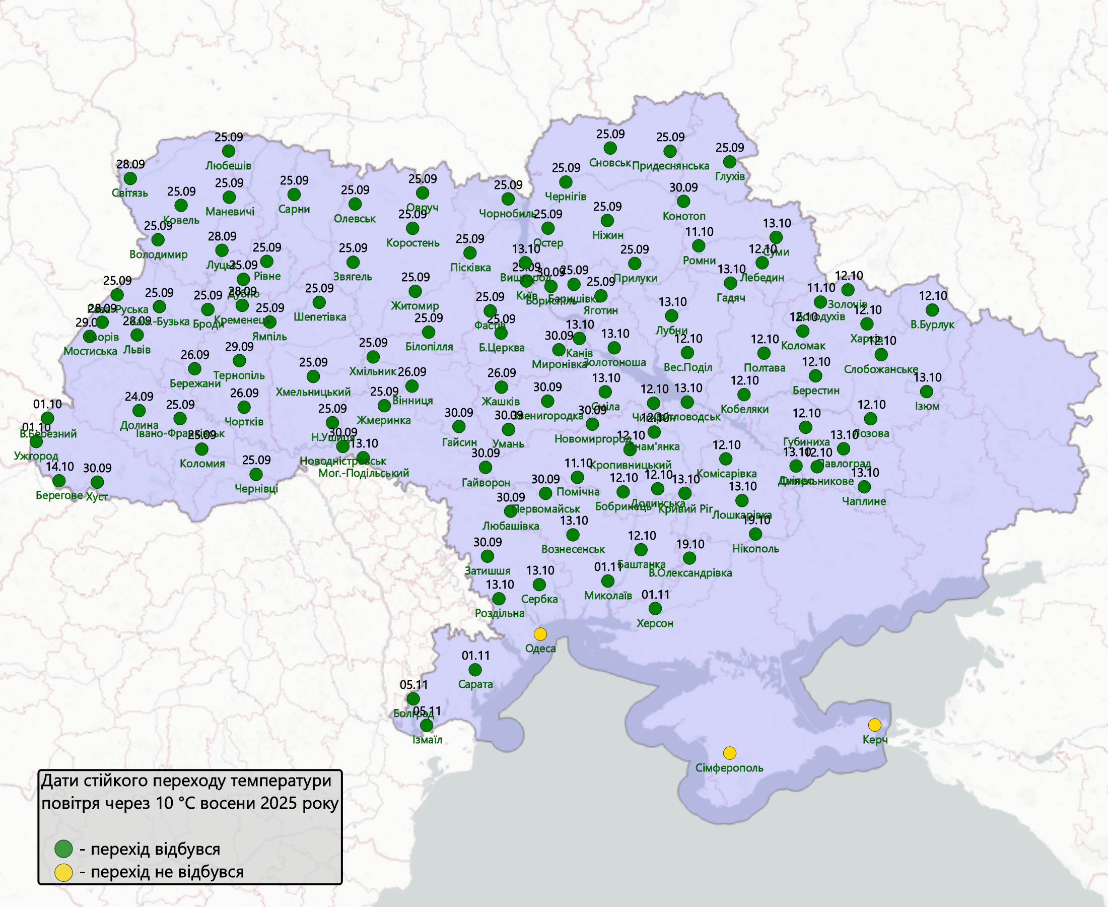 Дати переходу температури повітря через +10 оС у бік зниження станом на 11 листопада 2025 року